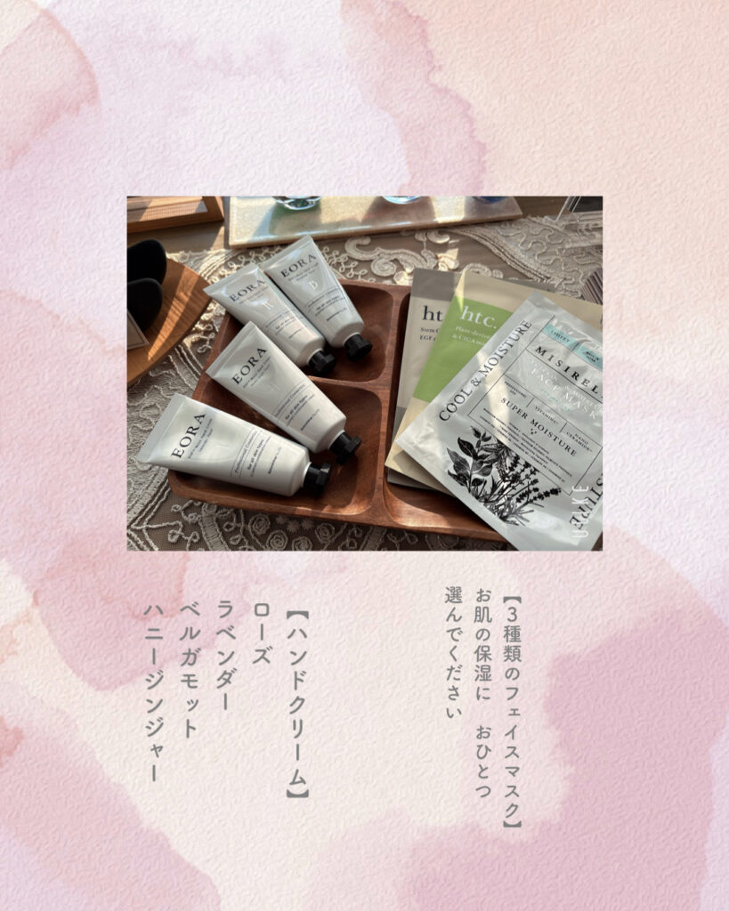 ハンドクリームは香りを選んでいただけます。フェイスマスクで暖房で乾燥するお肌の保湿ケアを🌹